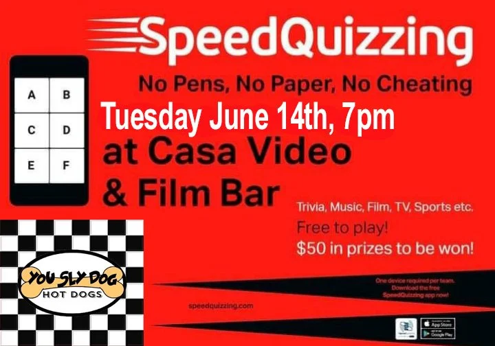 Grab your friends! Grab your phone! Grab a seat! We've got SpeedQuizzing team trivia! The folks from You Sly Dog will be here with their delicious hot dogs by 6. Trivia starts at 7.