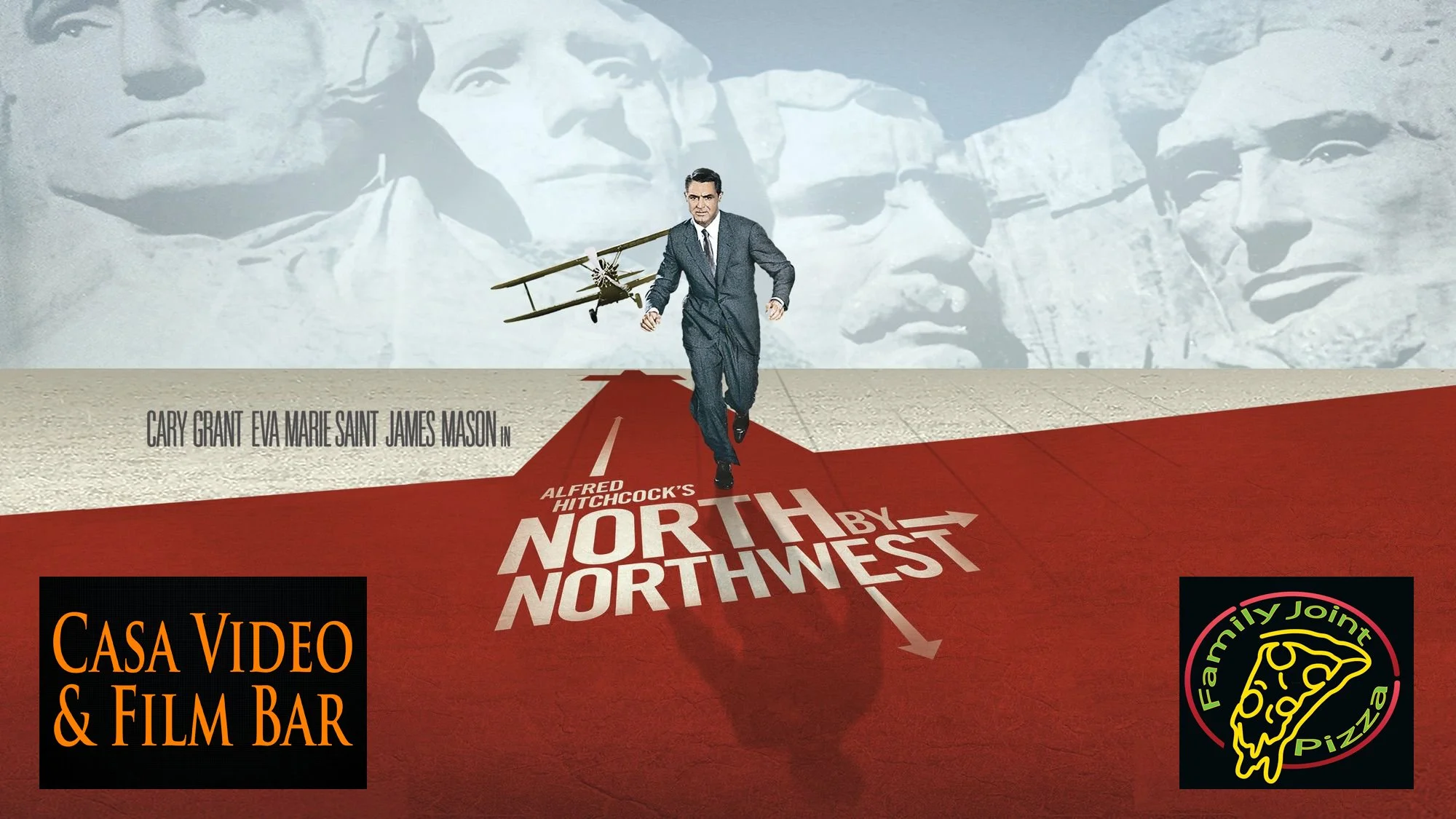 We’re watching one of Hitchcock’s finest, 1959’s “North By Northwest”. Family Joint Pizza will be here with their delicious pies. They’ll be here by 6pm. The movie starts at 7pm!