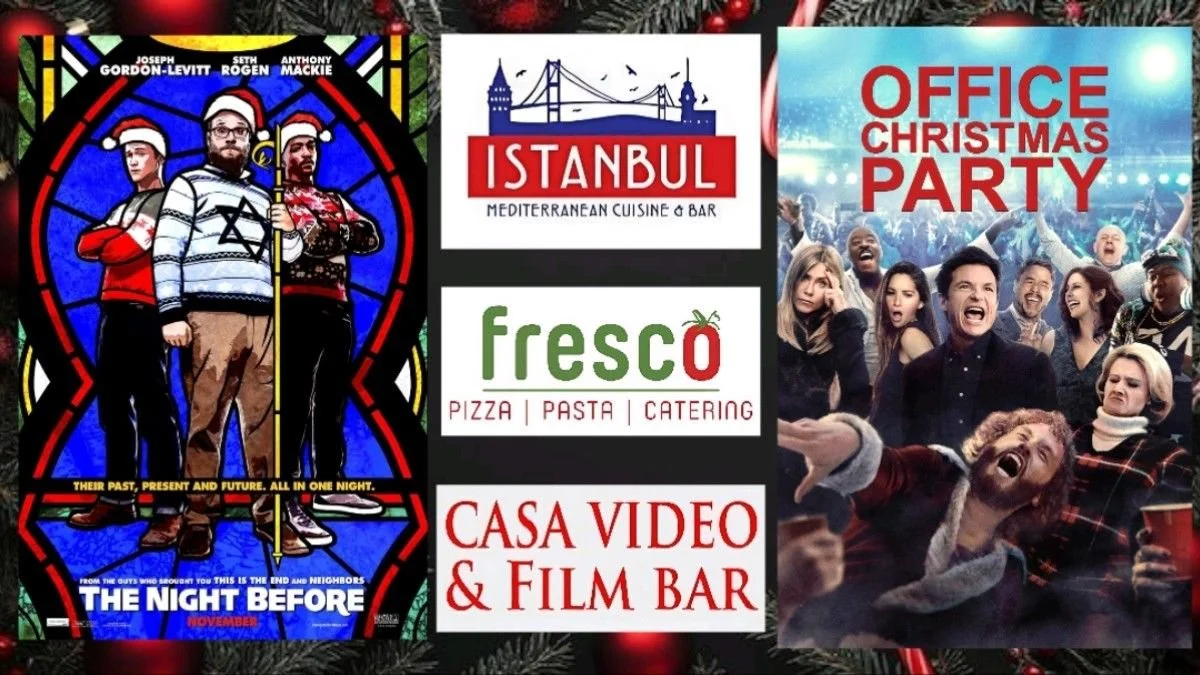 It’s Monday Night Double Feature. By Request! Deck the Halls! at 8pm we start off this festive night with 2015’s comedy “The Night Before”. Then at 10pm we have 2016’s “Office Christmas Party”. Unfortunately we don’t have a food truck tonight but our awesome neighbors Istanbul Mediterranean Cuisine, you can call in for a pick up that will be ready in minutes. Also our great friends at Fresco Pizzeria & Pastaria will deliver to us with no delivery charge. The first movie starts at 8pm.