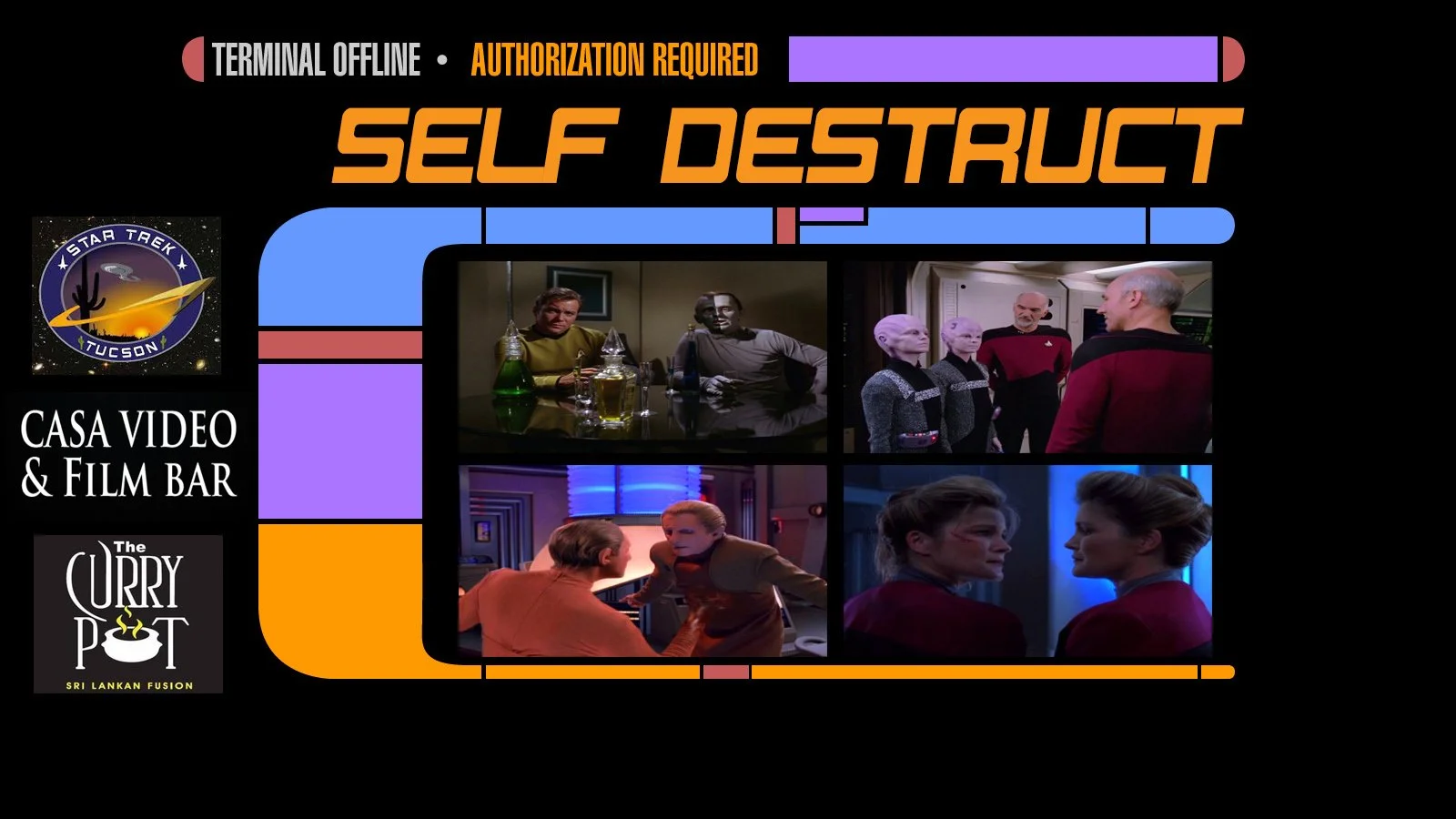 The Star Trek Tucson Fan Club is here for their monthly meeting. Tonight’s theme is “Self Destruct”. We have four classic episodes from some of our favorite series. We start off with ST:TOS Season 3 Episode 15 the classic “Let That Be Your Last Battlefield”. Next ST:TNG Season 1 Episode 15 “11001001”. We’re rounding the bases with ST:DS9 Season 3 Episode 26 “The Adversary” and bringing it home ST:Voyager Season 2 Episode 21 “Deadlock”. Our great friends The Curry Pot food truck will be outside filling bellies with their delicious food.. It all starts at 6PM.