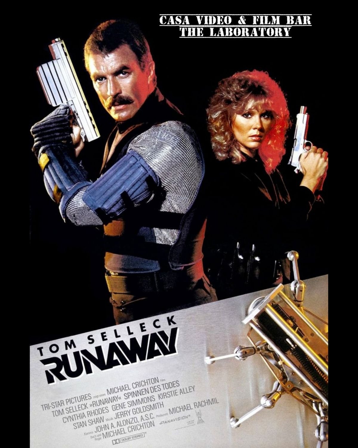 Welcome to The Laboratory. We’ve got Tom Selleck, Gene Simmons, and Kristie Alley. Michael Crichton pulling double duty, writing and directing. Join us for 1984’s robotic thriller “Runaway”. Cri The movie starts at 2pm. Get here early for a good seat.