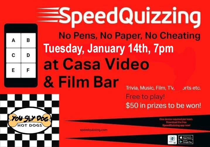 Grab your friends! Grab your phone! Grab a seat! We've got SpeedQuizzing team trivia! The folks from You Sly Dog will be here with their delicious hot dogs by 6. Trivia starts at 7pm.
