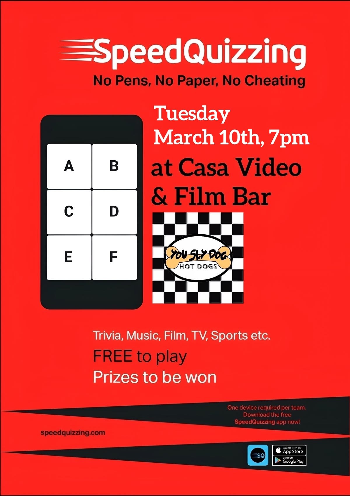 Grab your friends! Grab your phone! Grab a seat! We’ve got Speedquizzing team trivia! Outside, the folks from You Sly Dog will be here with their delicious hot dogs by 6. Trivia starts at 7pm.