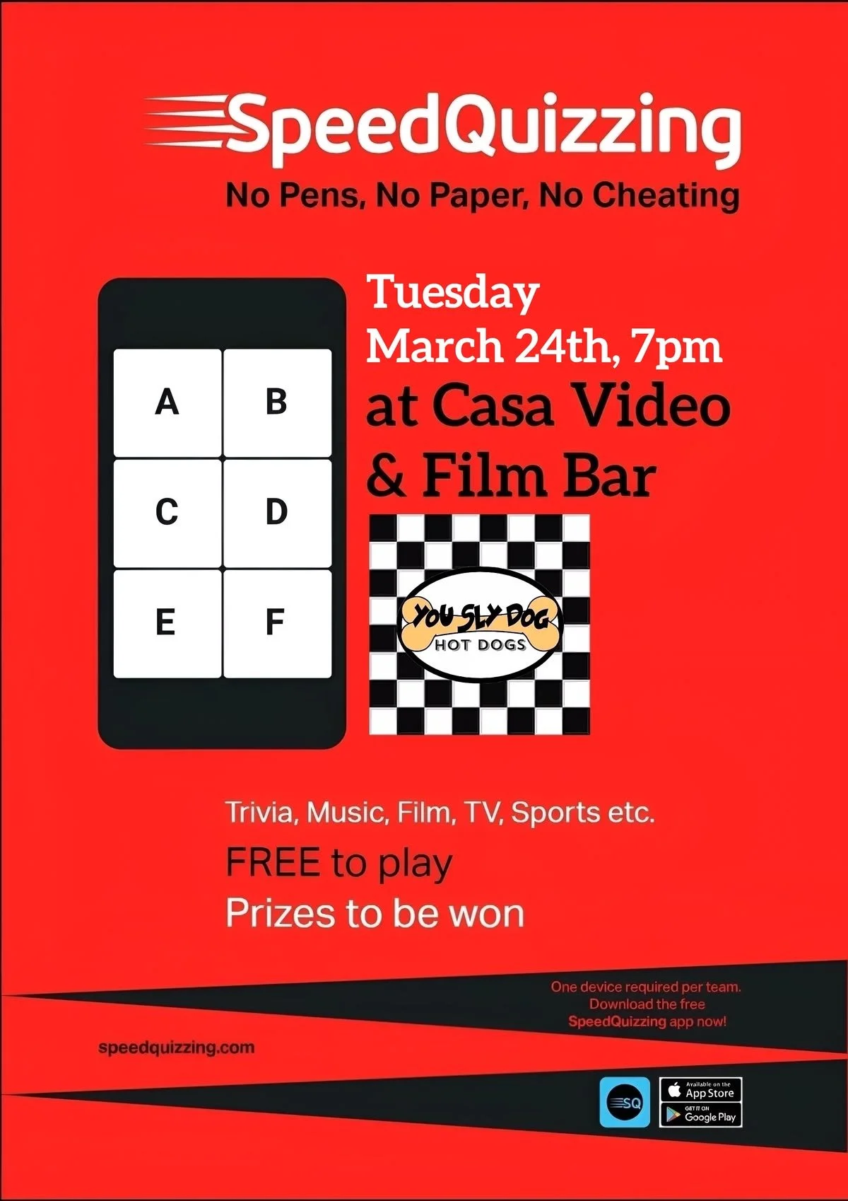 Grab your friends! Grab your phone! Grab a seat! We’ve got Speedquizzing team trivia! Outside, the folks from You Sly Dog will be here with their delicious hot dogs by 6. Trivia starts at 7pm.