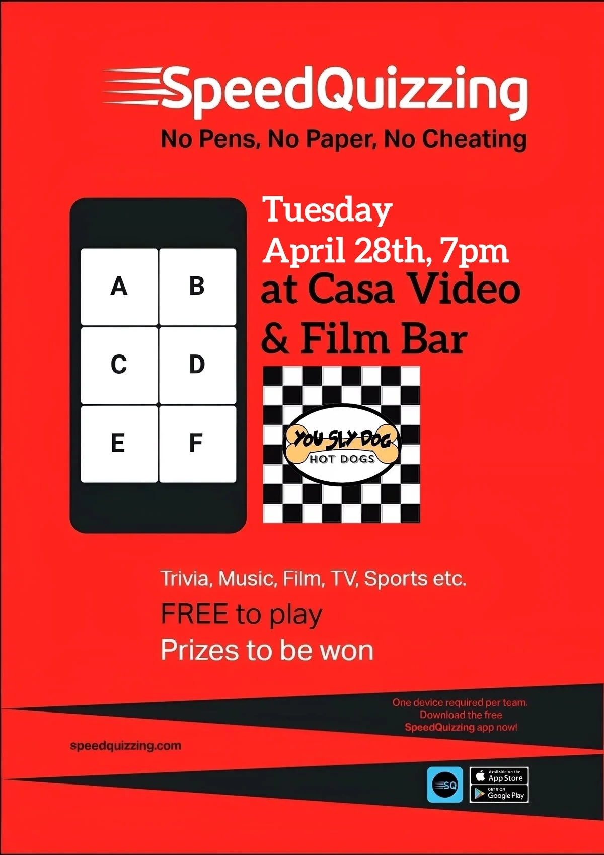 Grab your friends! Grab your phone! Grab a seat! We’ve got Speedquizzing team trivia! Outside, the folks from You Sly Dog will be here with their delicious hot dogs by 6. Trivia starts at 7pm.