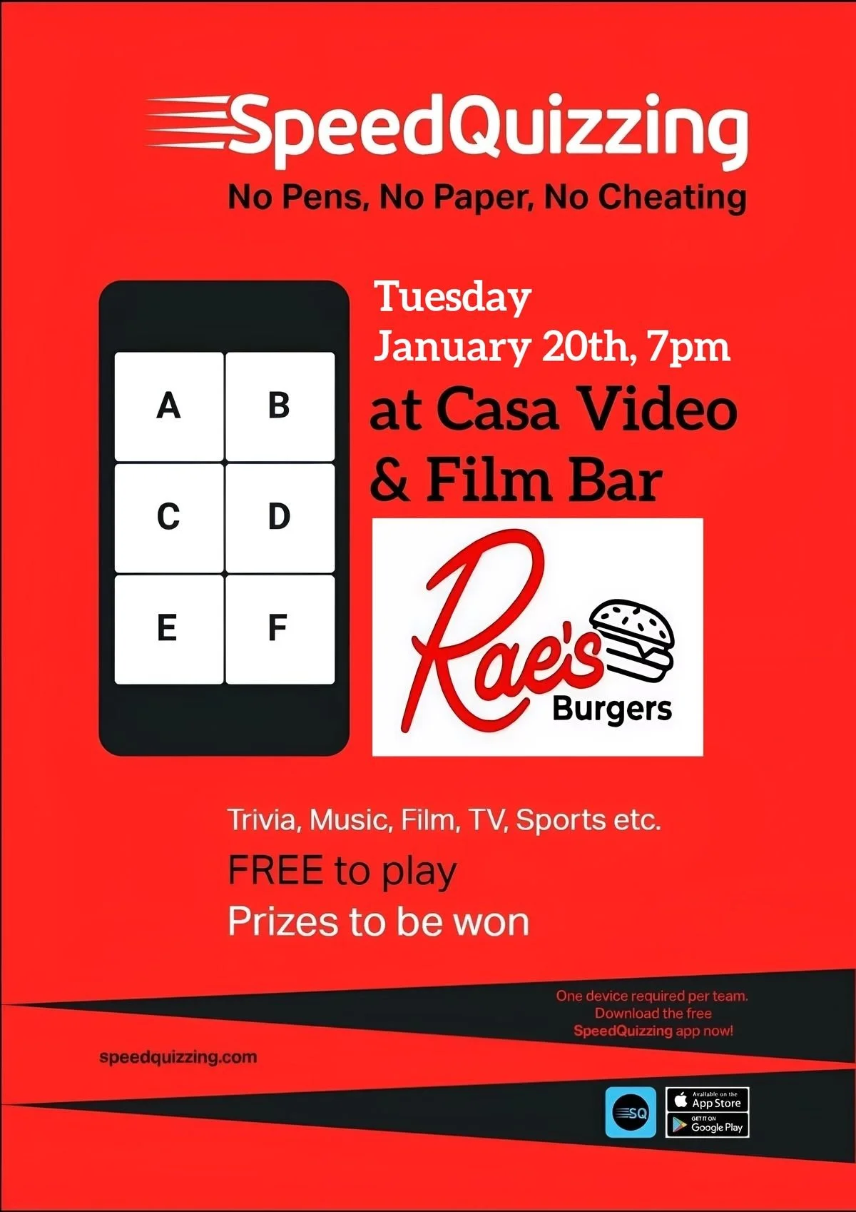 Grab your friends! Grab your phone! Grab a seat! We've got SpeedQuizzing team trivia! The folks from You Sly Dog will be here with their delicious hot dogs by 6. Trivia starts at 7pm.
