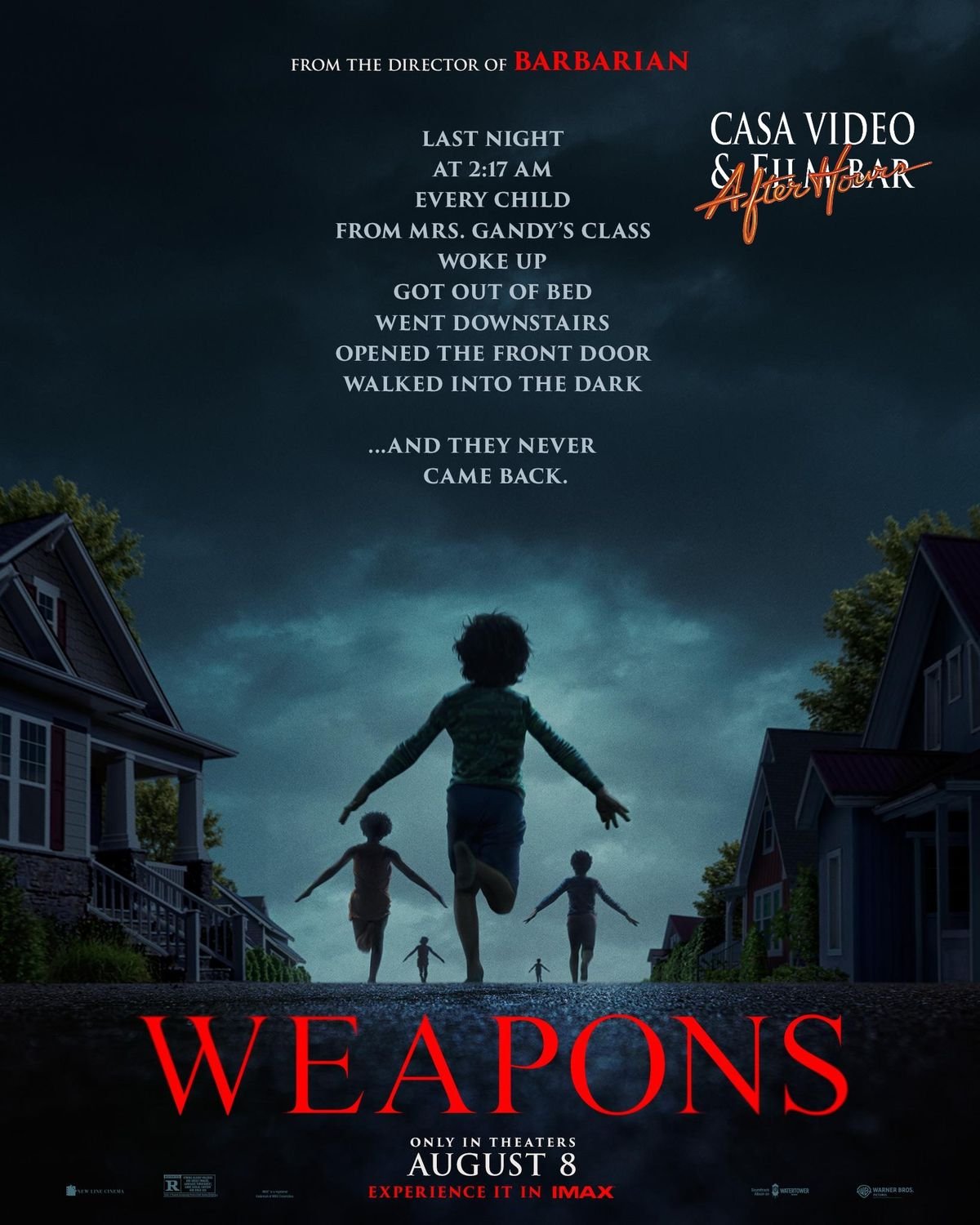 Casa Video After Hours! This is for the late night crowd. One of the most talked about films of the year. Join us for 2025’s mystery horror film “Weapons’. The movie starts 9:00pm. Get here early for a good seat.