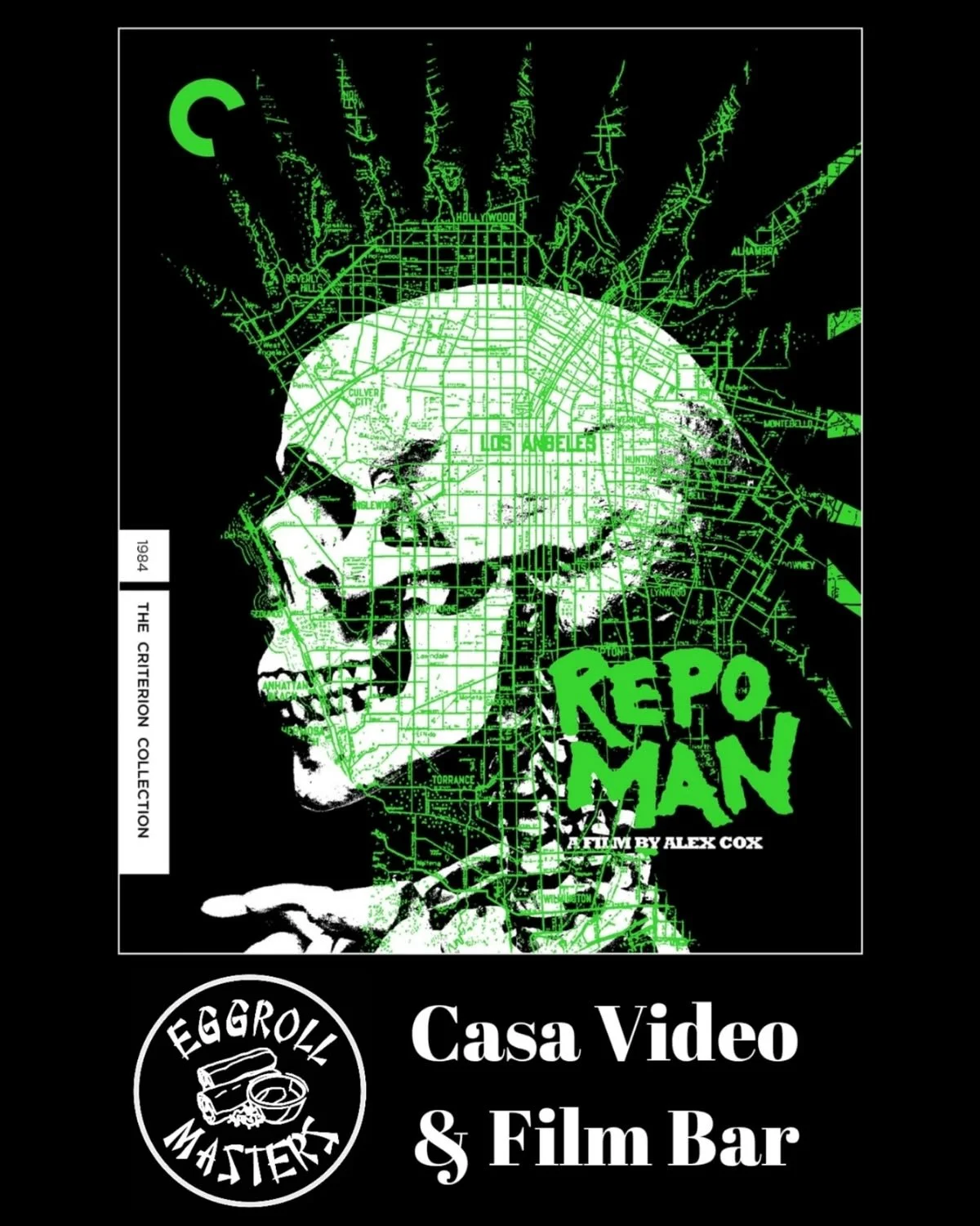 Well here we go! Playing an obvious Alex Cox double feature. join us for the Criterion Collection remaster of 1984’s iconic “Repo Man”. Outside we’ll have EggRoll Masters on our patio.