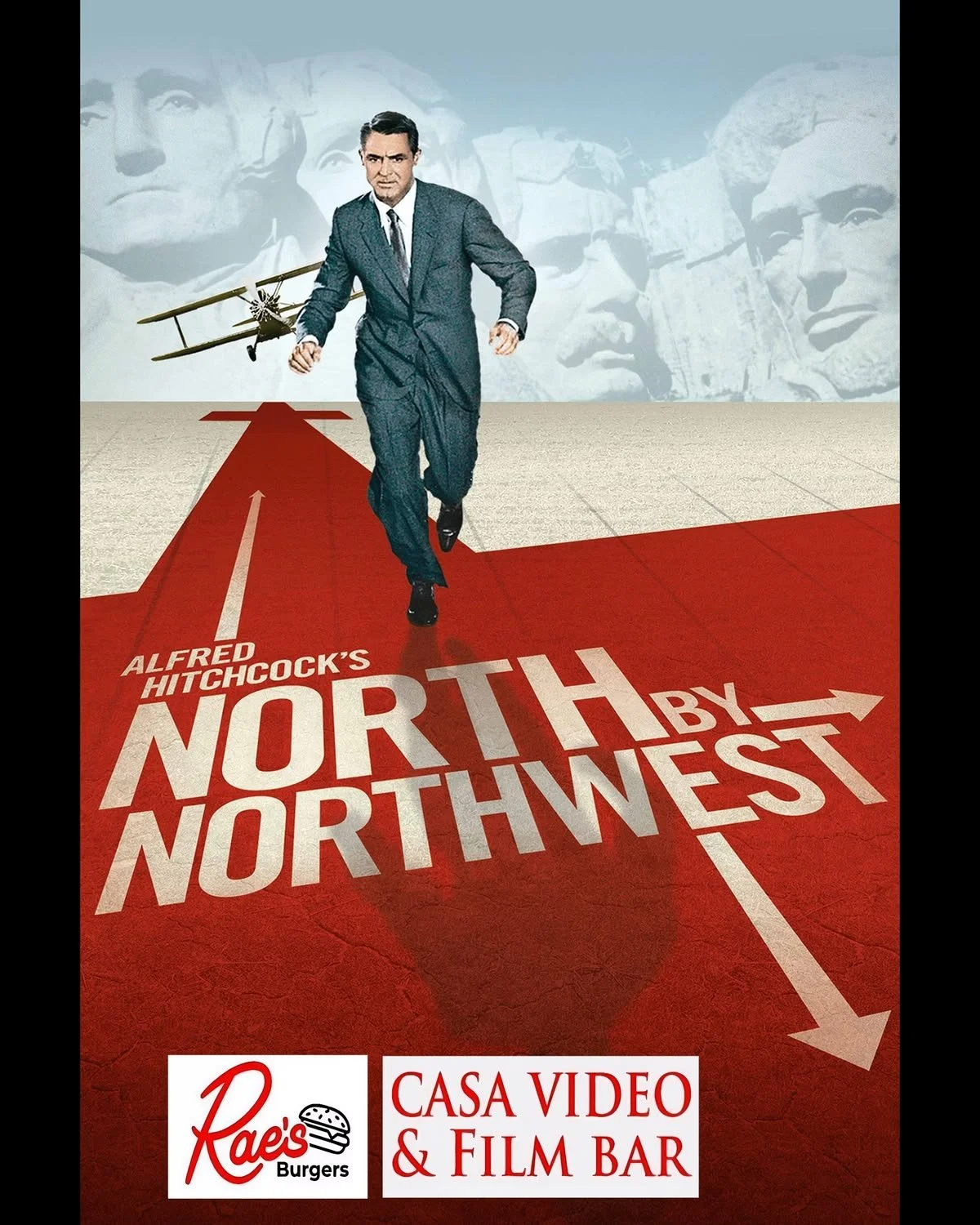 Join us for one of the best films by one one the best Directors. Alfred Hitchcock with 1959’s “North by Northwest”. Outside we’ll have Rae’s Burgers on our patio. The movie starts at 7pm, Rae’s Burgers will be here by 6pm.