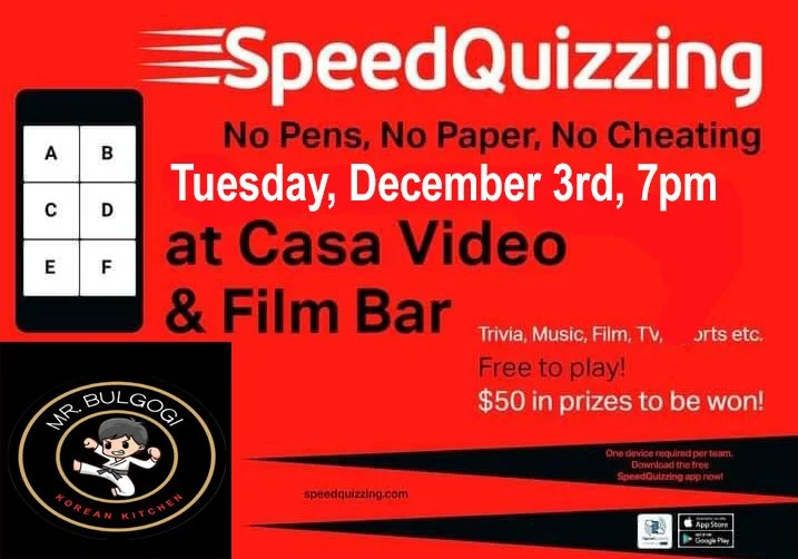 Grab your friends! Grab your phone! Grab a seat! We've got SpeedQuizzing team trivia! Mr. Bulgogi will be here by 6pm to satisfy any hunger. Trivia starts at 7pm.