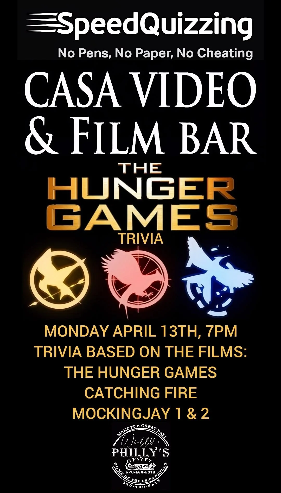 Monday…April 13th, 7pm. Grab your phone! Grab your friends! Grab the best weapons! We are having a “The Hunger Games” Trivia! All questions will be based on the 4 films, not the books. Prizes for the top 3 teams. Those who dress up get points for their team. Tonight was have the tasty Willy’s Philly’s out on our patio. They’ll be here by 6pm. Trivia is at 7. At 9pm we’ll 2012’s first film “The Hunger Games”. Get here for a good seat.