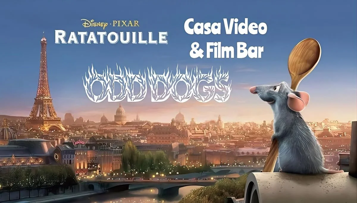 We’re watching 2007’s Pixar classic “Ratatouille”. Outside the awesome & delicious Odd Dogs Hot Dogs will be here here by 6pm. Movie starts at 7pm.